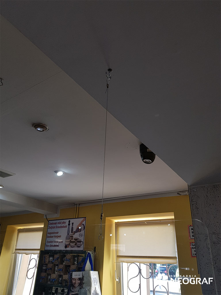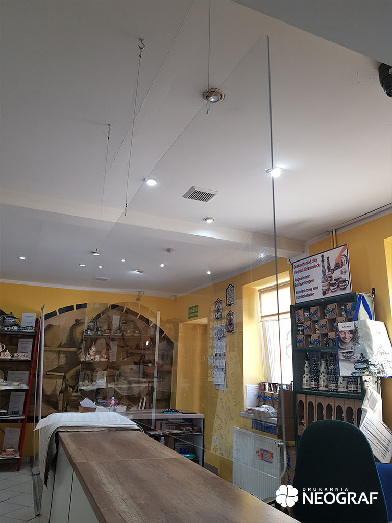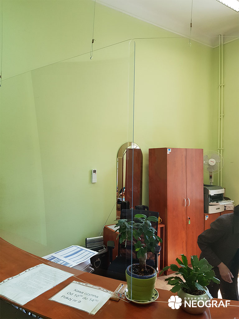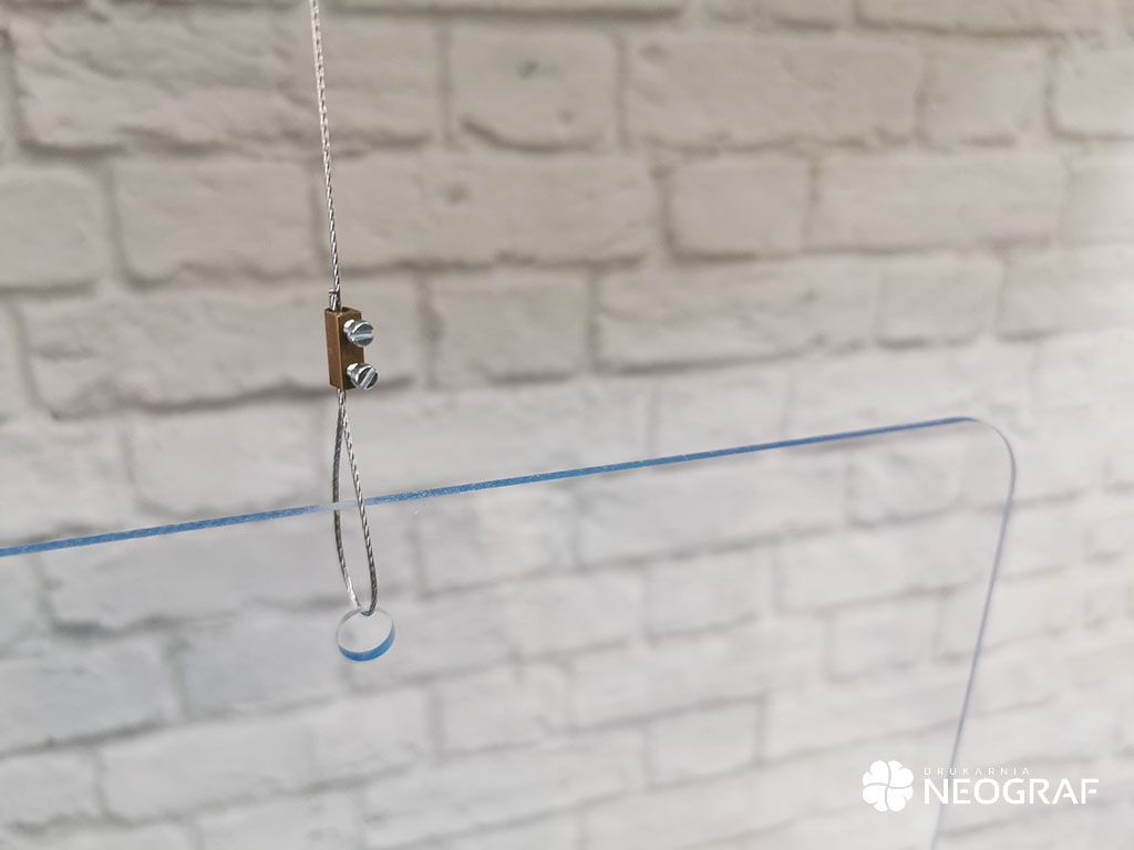 Plexa ochronna dzięki zawieszeniu na linkach stalowych , nie zajmuje dodatkowego miejsca na ladzie lub biurku. Podobnie jak stojąca, stanowi fizyczną ochronę przed wirusami.