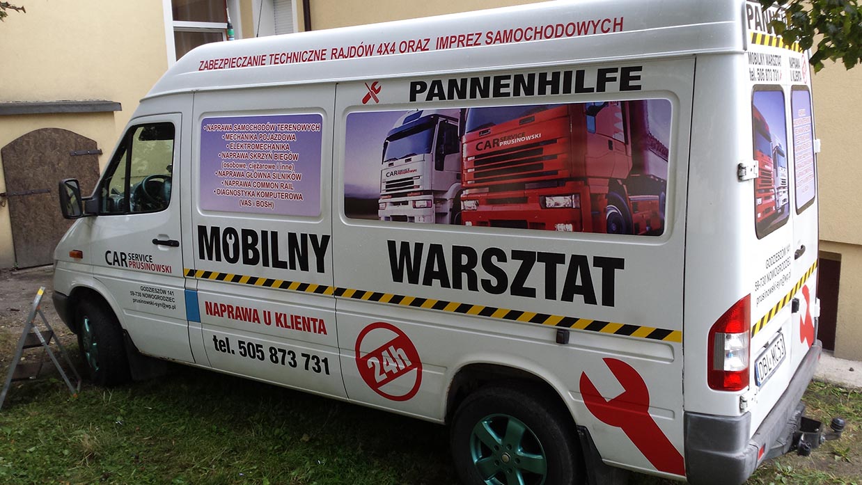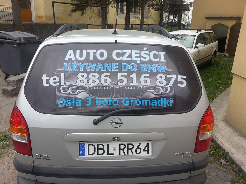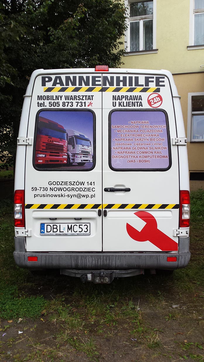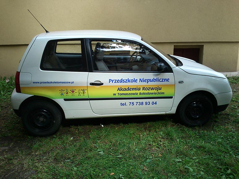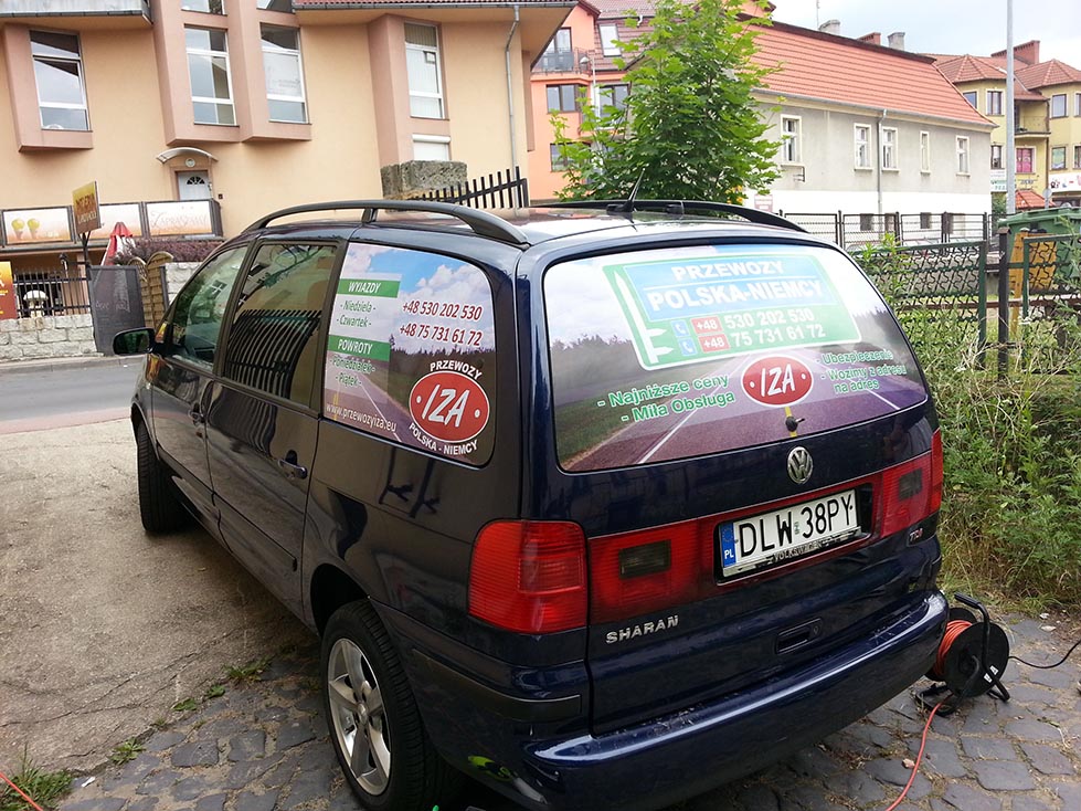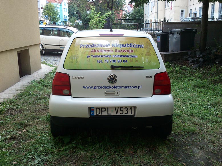 Samochód (VW Lupo) wykonany dla Przedszkola Publicznego w Tomaszowie Bolesławieckim. Samochód (VW Lupo) wykonany dla Przedszkola Publicznego w Tomaszowie Bolesławieckim. Folia OWV na Mercedesie Vito dla firmy zajmującej się wykończeniami wnętrz. Auto Części (Opel Zafira) - tylna szyba, folia OWV. Volkswagen Sharan - Przewozy osobowe IZA - folia OWV. Mercedes Sprinter dla firmy BKM SERWIS- projekt obejmujący zmianę koloru tylnej części pojazdu przy pomocy folii w kolorze czerwonym, wyklejenie logotypu i napisów wyciętych z folii. Na tylnych drzwiach został przyklejony przygotowany przez klienta nadruk. Mercedes Sprinter dla firmy BKM SERWIS- projekt obejmujący zmianę koloru tylnej części pojazdu przy pomocy folii w kolorze czerwonym, wyklejenie logotypu i napisów wyciętych z folii. Na tylnych drzwiach został przyklejony przygotowany przez klienta nadruk. BMW BC-RALLY - w pierwszej fazie powstał projekt komputerowy oklejenia BMW, następnie po akceptacji klienta był krok po kroku realizowany. BMW BC-RALLY - w pierwszej fazie powstał projekt komputerowy oklejenia BMW, następnie po akceptacji klienta był krok po kroku realizowany. Paintball Ławszkowa - Opel Tigra. Na tylnej szybie zostały naklejone napisy wycięte z folii samoprzylepnej oraz kształty opodobnione do śladów zostawianych przez kulki z farbą. Mercedes Sprinter - Mobilny warsztat. Projekt od podstaw oraz wykonanie przy użyciu różnego radzaju folii samoprzylepnych zadrukowanych lub barwionych fabrycznie. Mercedes Sprinter - Mobilny warsztat. Projekt od podstaw oraz wykonanie przy użyciu różnego radzaju folii samoprzylepnych zadrukowanych lub barwionych fabrycznie. Przyczepa dla restauracji Alanya Kebap House w Bolesławcu - Projekt w całości wykonany z zadrukowanej folii samoprzylepnej. Wyklejenie plandeki przyczepy dla Ośrodka Kształcenia Kursowego - 2 x Tak. Wykonanie - specjalna folia do plandek wycięta na ploterze. Wyklejenie plandeki przyczepy dla Ośrodka Kształcenia Kursowego - 2 x Tak. Wykonanie - specjalna folia do plandek wycięta na ploterze. Renault Master - wykonanie ze specjalnej folii odblaskowej, oraz na szybach użyta została folia OWV.