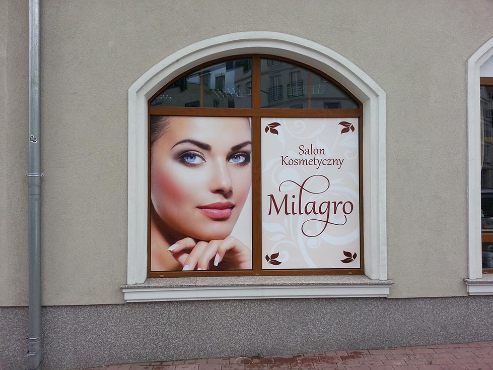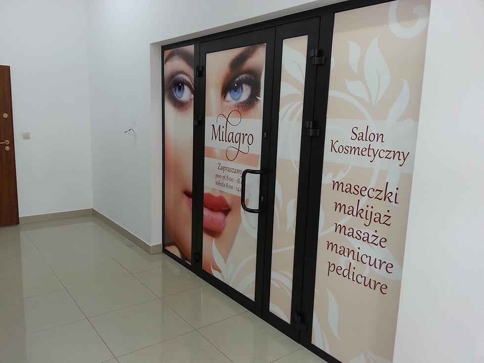 Salon kosmetyczny Milagro - drzwi wejściowe do salonu wewnątrz budynku. Zadrukowana folia monomeryczna. Salon kosmetyczny Milagro - okna na zewnątrz budynku. Zadrukowana folia monomeryczna. Folia OWV na oknie oraz szyld na płycie PCV. Ponad 5 metrowy banner wykorzystany jako szyld. Firma HPR Legnica.
